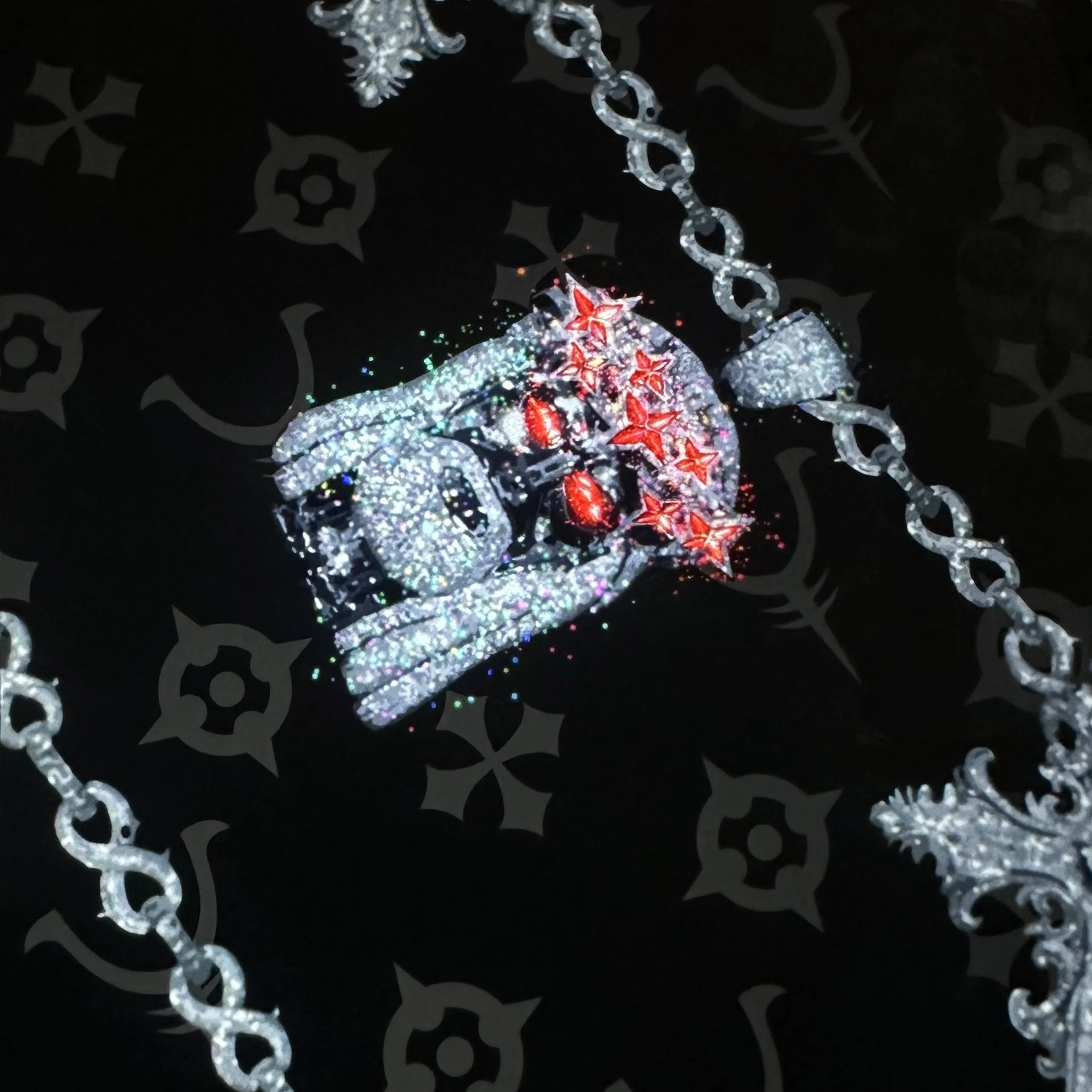 The inspiration for this piece came from my own sense of duality — the constant pull between succumbing to my vices and striving toward my higher self. The irony of expressing one’s faith through diamonds, which may have been cultivated through hardship or even blood, reflects that duality within us all. It serves as a reminder that sacrifice is often the price of greatness, and that our struggles and virtues coexist in shaping who we are.