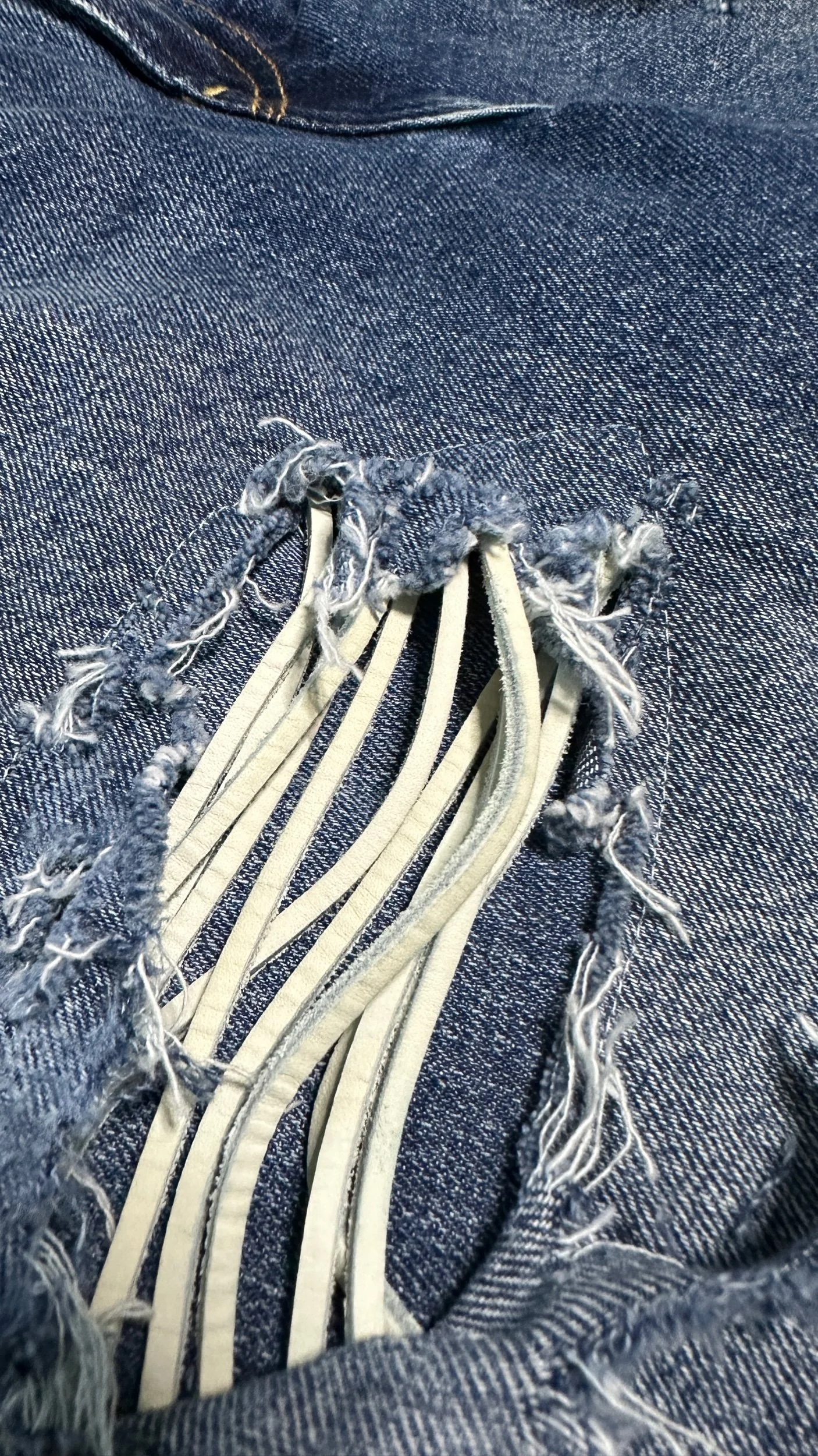Constructed using layered paneling and unconventional material placement, the Mummra denim challenges traditional structure. Leather peeps through the leg openings as if it was distressed. The wide leg silhouette creates volume while maintaining weight through the fabric.