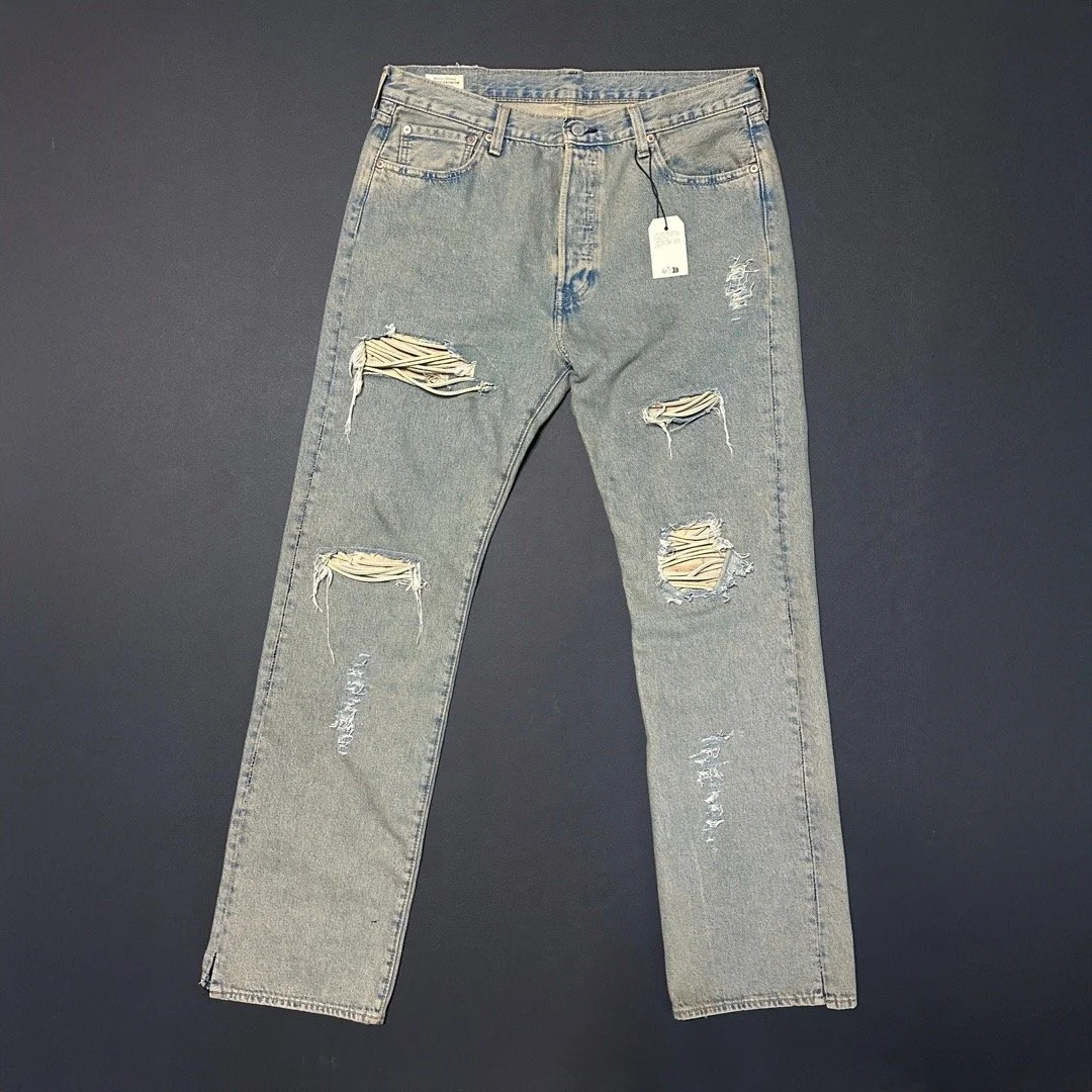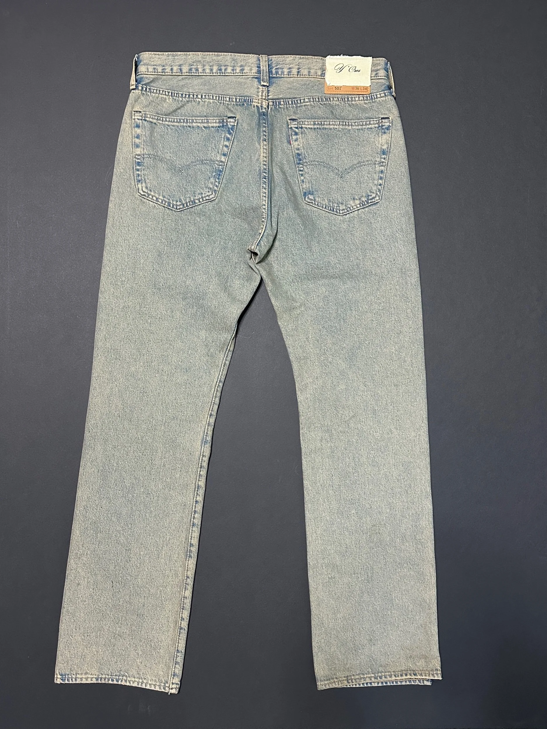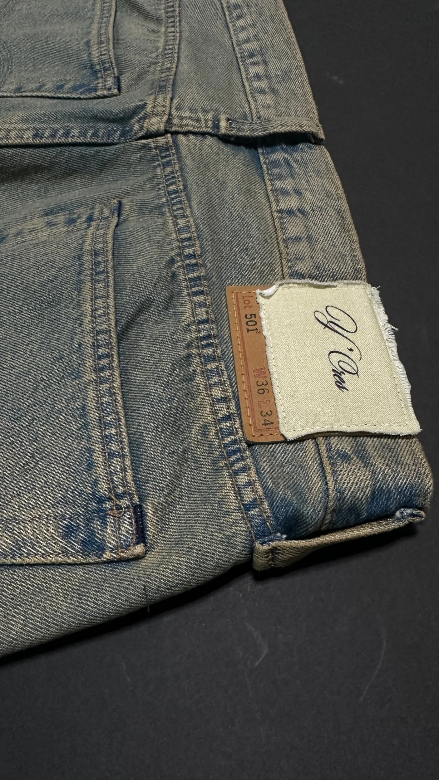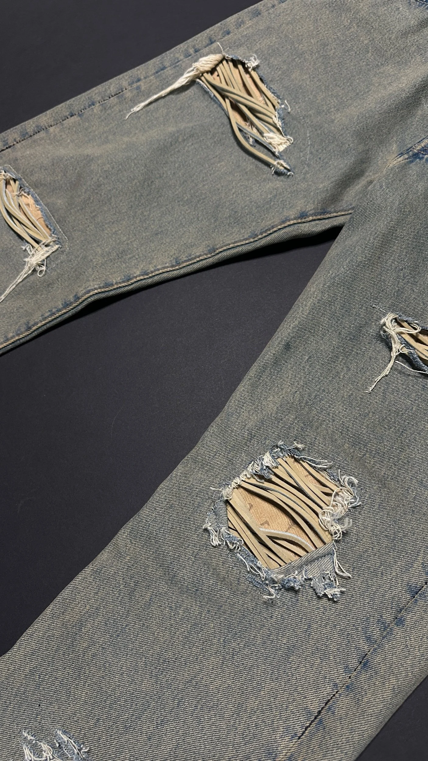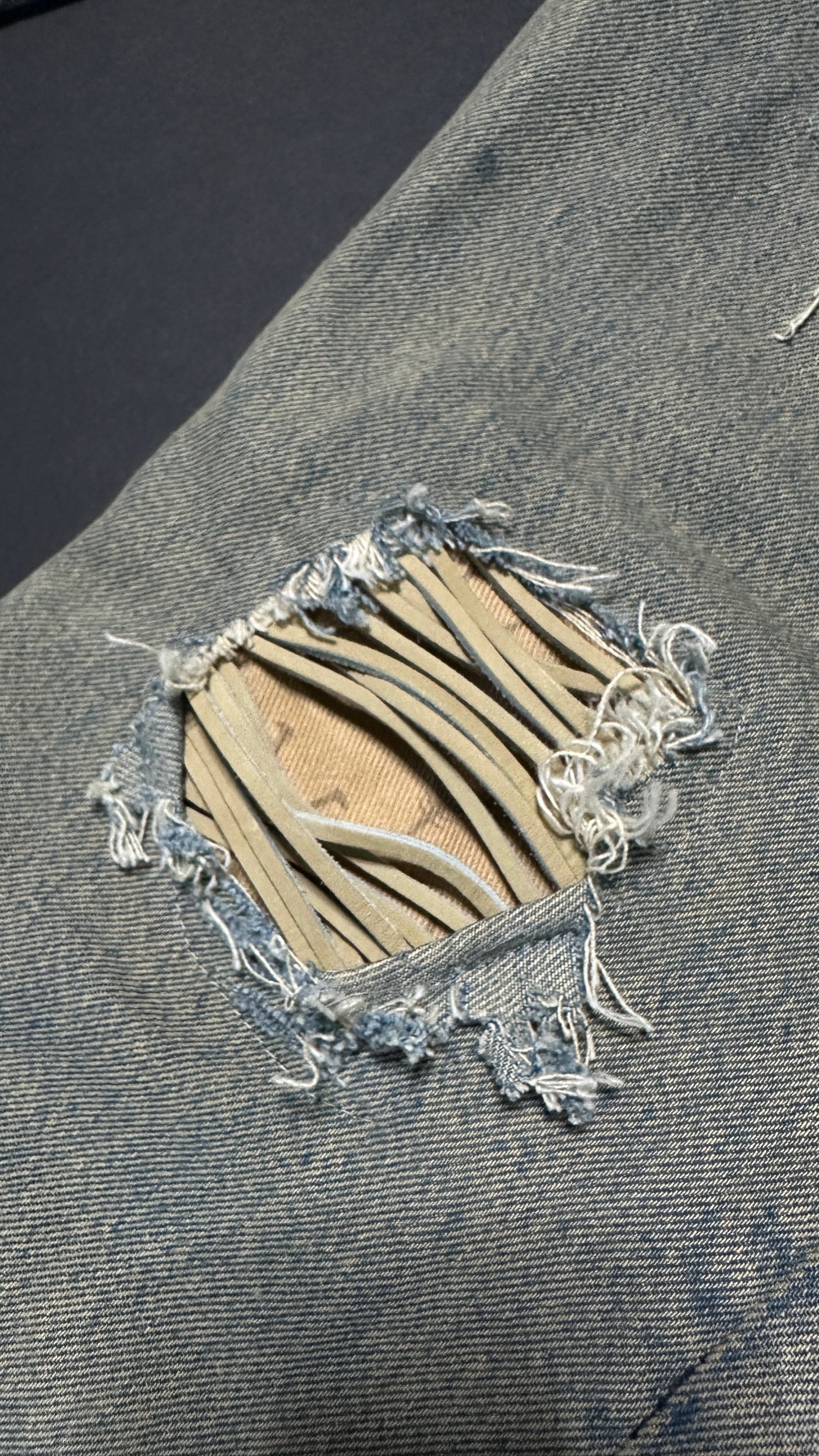 Constructed using layered paneling and unconventional material placement, the Mummra denim challenges traditional structure. Leather peeps through the leg openings as if it was distressed. Underneath the leather hides a monogram printed denim.